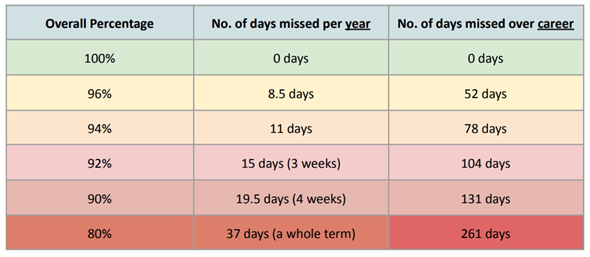 Attendance percentages can be misleading. 90% attendance may seem like a good level of attendance. However, the reality is that 90% attendance means that your child will miss half a day of school each week or 19.5 days of school during the school year. That is nearly four school weeks. The table below shows the amount of lost learning a child may have missed over a year and over a whole school career by missing school.